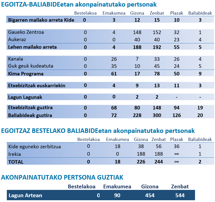 Gaueko harrera: 365 egun urtean, 32 plazarekin. Oinarrizko premiak asetzea eta informazioa, orientazioa eta laguntza ematea. Egonaldiaren iraupena aldatu egiten da egoeraren arabera.